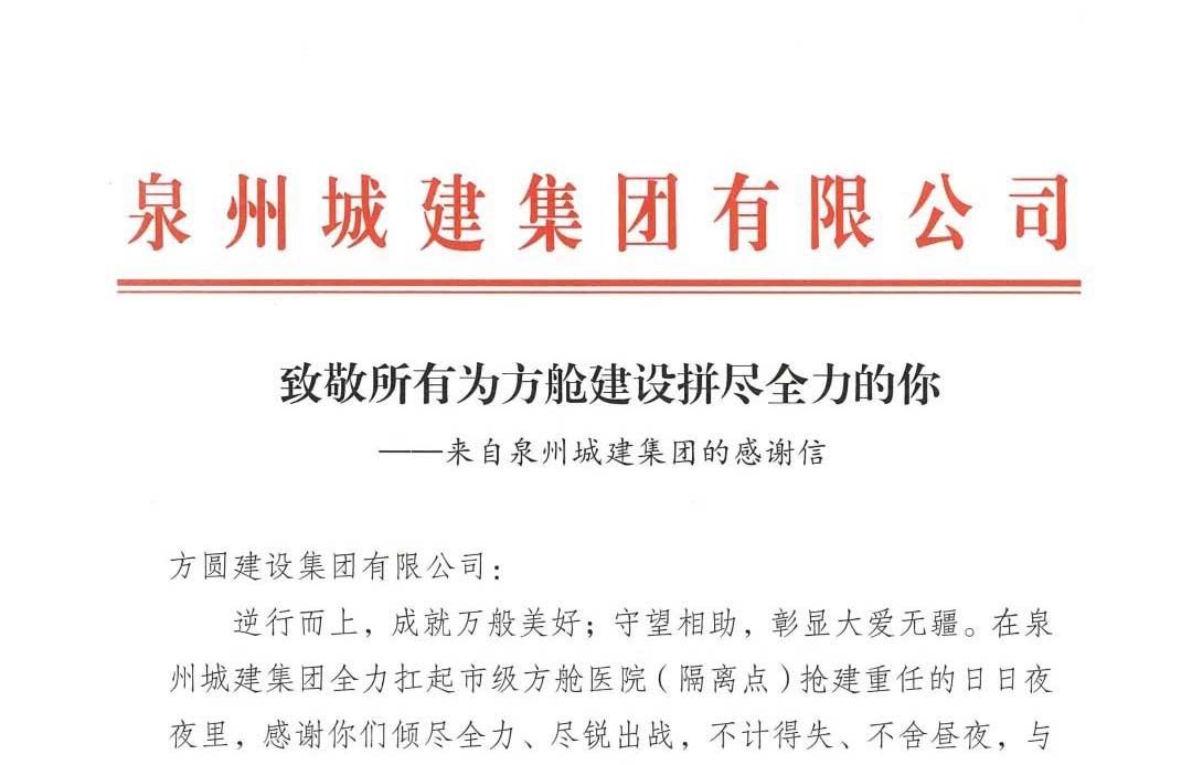 隨著社區(qū)逐步解封一切美好歸位之際泉州城建集團(tuán)有限公司送來一封感謝信由衷感謝方圓建設(shè)集團(tuán)在疫情期間以沖鋒在前,迎難而上的擔(dān)當(dāng)參與泉州方艙(隔離點(diǎn))建設(shè)為全市打贏疫情防控殲滅戰(zhàn)保障人民群眾生命安全貢獻(xiàn)一份力量信中寫到在泉州疫情爆發(fā)危急時(shí)刻方圓建設(shè)集團(tuán)火速集結(jié)、盡銳出戰(zhàn)不計(jì)得失、不舍晝夜充分發(fā)揮行業(yè)技術(shù)優(yōu)勢(shì)…