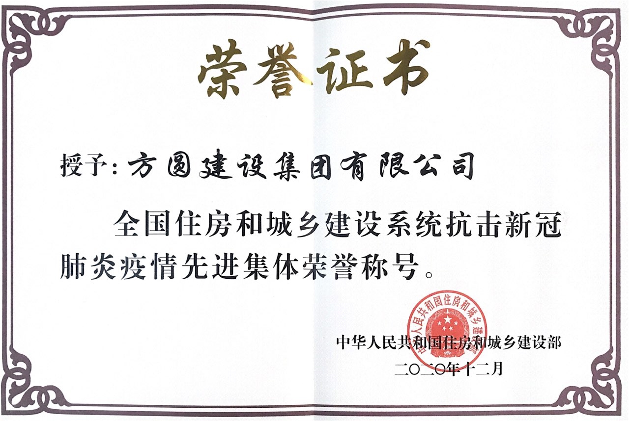 2020年12月25日,中華人民共和國住房和城鄉(xiāng)建設(shè)部在京召開全國住房和城鄉(xiāng)建設(shè)系統(tǒng)抗擊新冠肺炎疫情表彰視頻會(huì)議,隆重表彰全系統(tǒng)在新冠肺炎疫情防控斗爭中涌現(xiàn)出的先進(jìn)個(gè)人和先進(jìn)集體。方圓建設(shè)集團(tuán)榮獲“全國住房城鄉(xiāng)建設(shè)系統(tǒng)抗擊新冠肺炎疫情先進(jìn)集體”稱號。