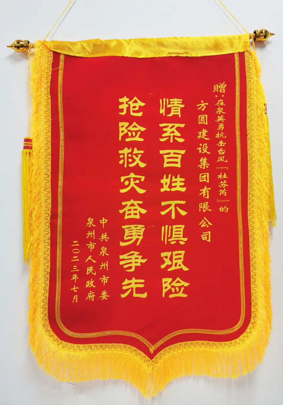 中共泉州市委,泉州市人民政府授予方圓建設(shè)集團“情系百姓不懼艱險,搶險救災(zāi)奮勇爭先”錦旗。