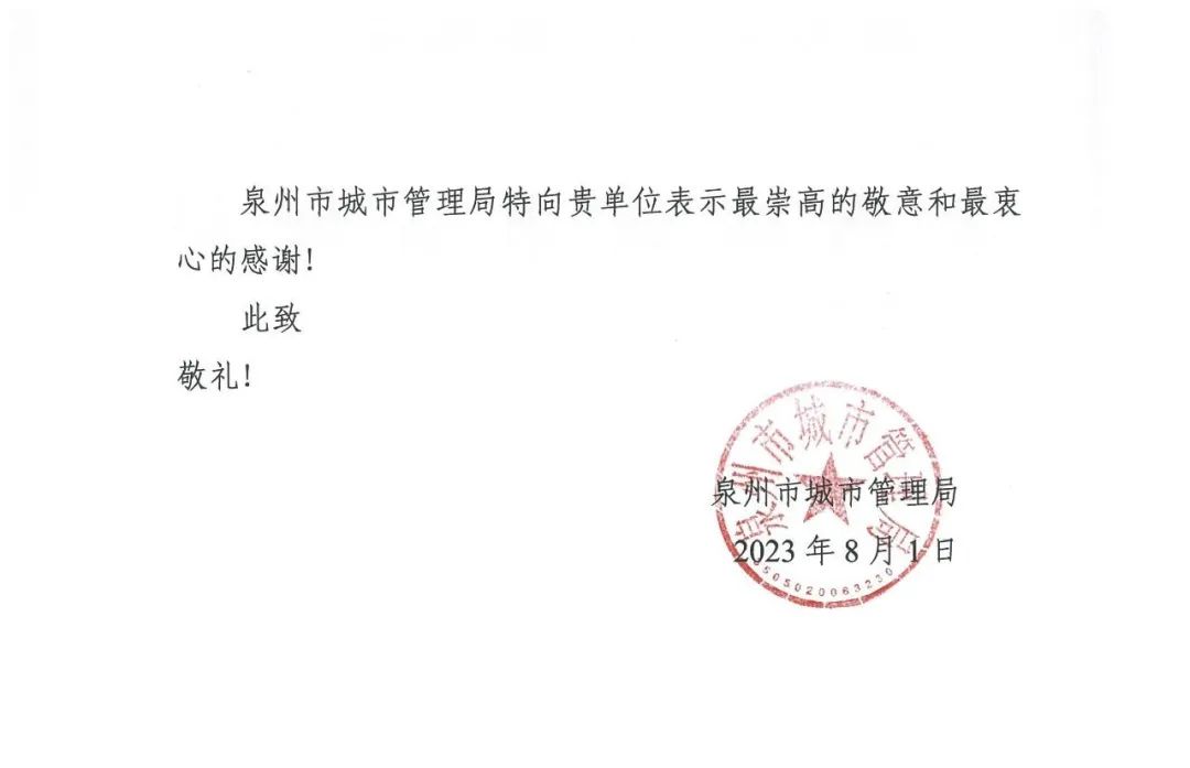 泉州市城市管理局發(fā)來感謝信,對方圓建設(shè)集團在抗擊臺風“杜蘇芮”的災(zāi)后救援期間,表現(xiàn)出的奮勇無畏與無私付出表示衷心的感謝并致以崇高的敬意。